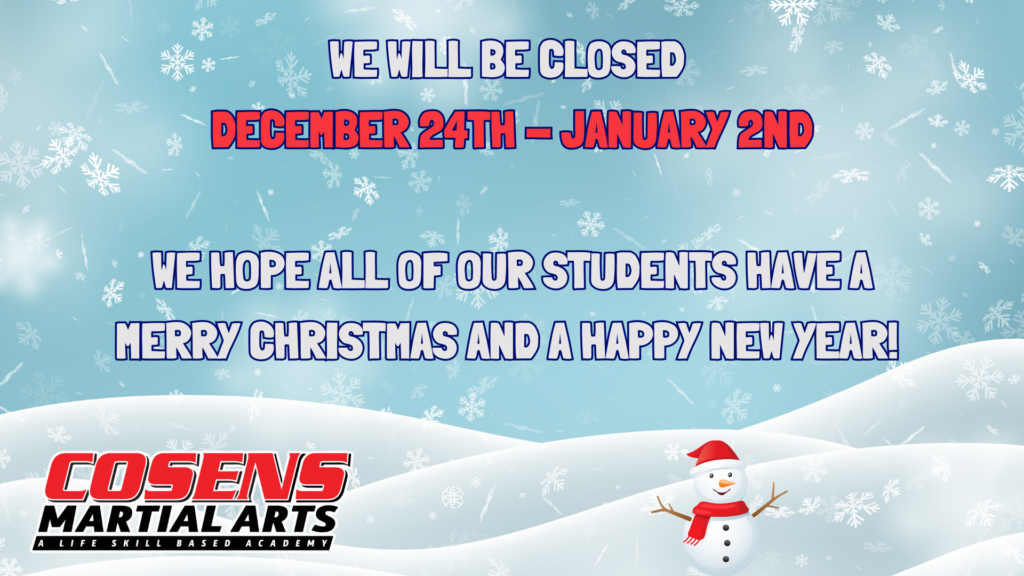 Cosens Martial Arts will be closed December 24th – January 2nd for the holidays.